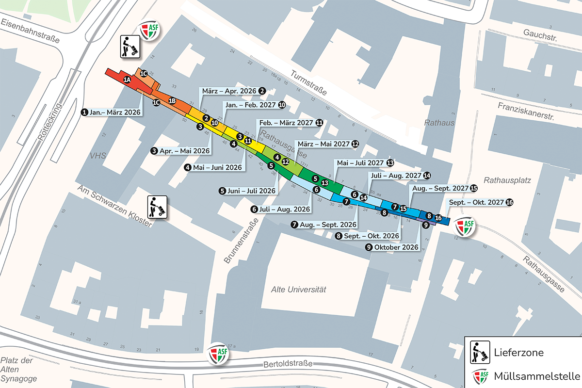 In der Zeit des Weihnachtsgeschäfts 2026 pausieren die Arbeiten für zwei Monate. Die Rathausgasse ist zu Fuß jederzeit passierbar und alle Geschäfte und Häuser bleiben erreichbar. Mit dem Auto ist während der Bauarbeiten keine Durchfahrt möglich.